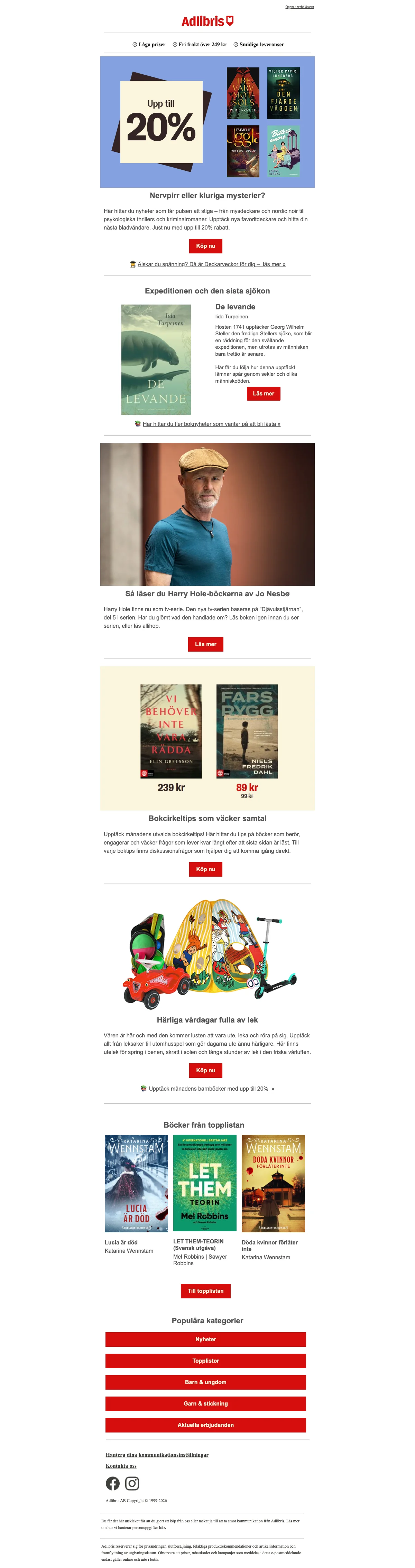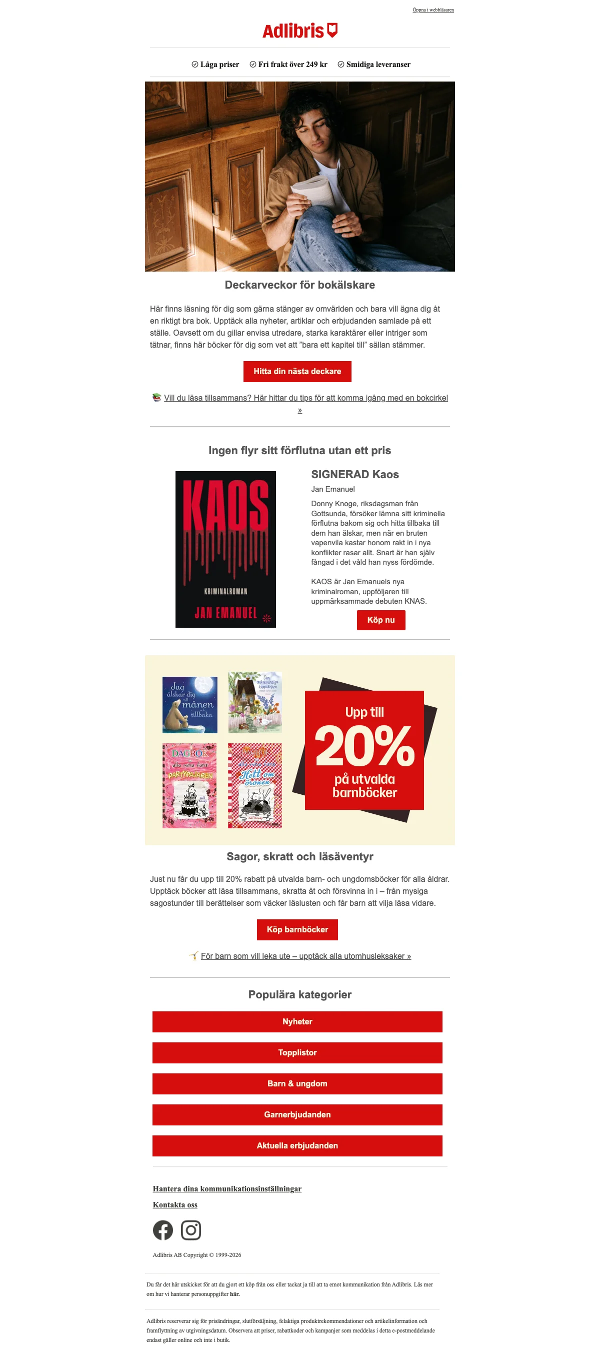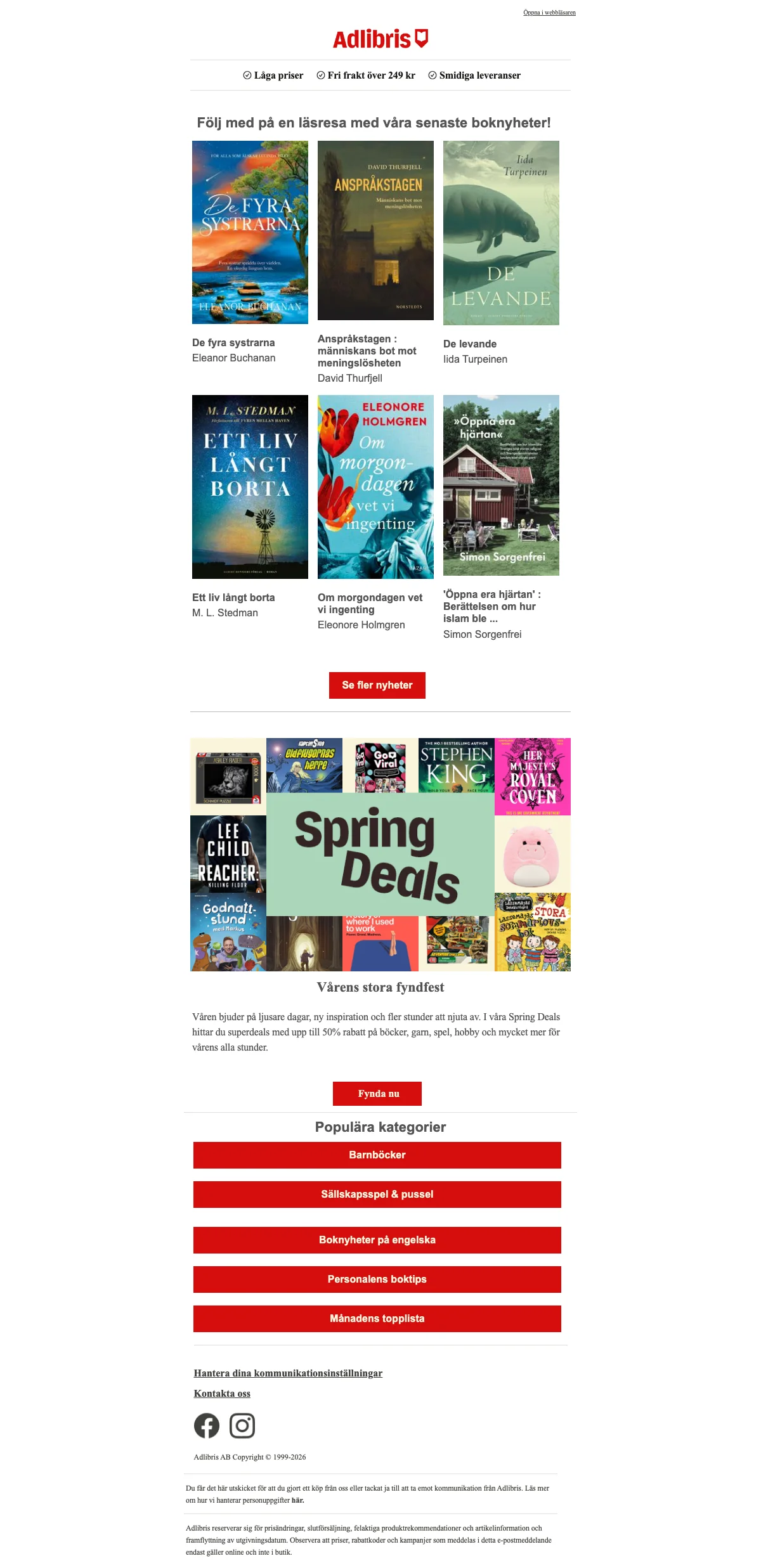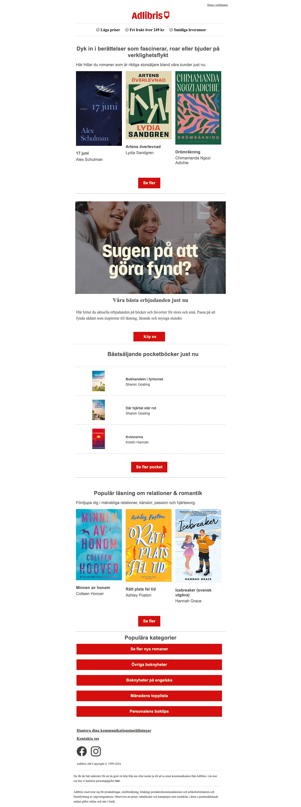 Vi övervakar kontinuerligt Adlibris erbjudanden via den officiella webbplatsen, partnernätverk och webbshopens nyhetsbrev. Nya erbjudanden kontrolleras automatiskt och manuellt för giltighet.