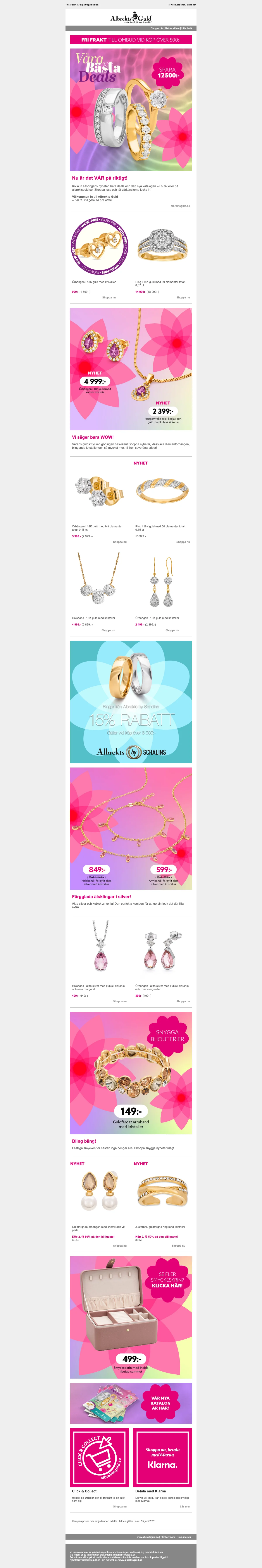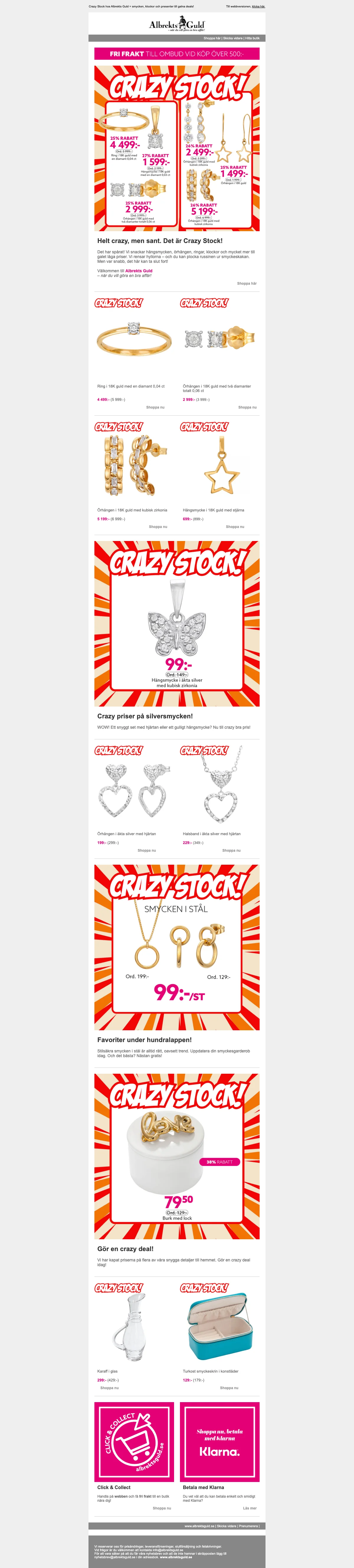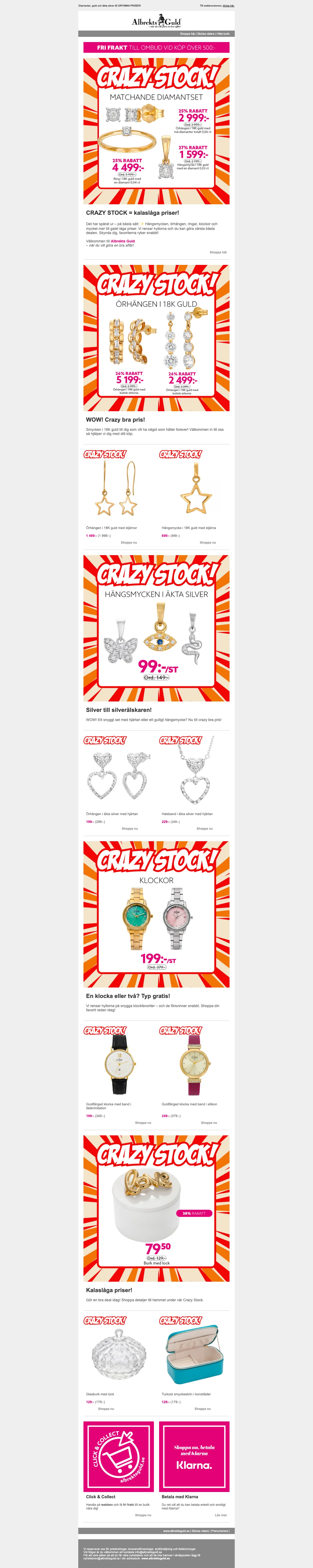 Butiken har alltid massor av grymma erbjudanden och kampanjer på allt från exklusiva diamantringar och klockor till armband och halsband i både silver och guld. Här finner du fotoramar, glas, smyckeskrin och självklart mycket mer. En rabattkod ger dig möjligheten att spara ännu mer pengar så du har råd att unna dig något extra fint. Under Albrekts guld rea och olika kampanjer får du möjligheten att fynda bland ett stort utbud produkter till superpriser.