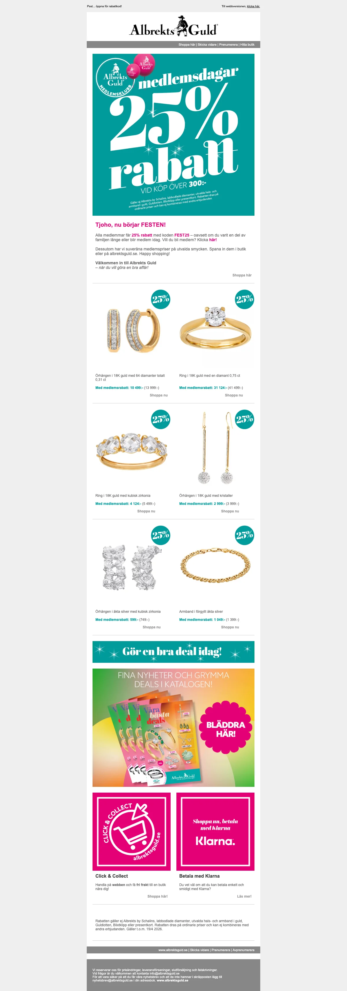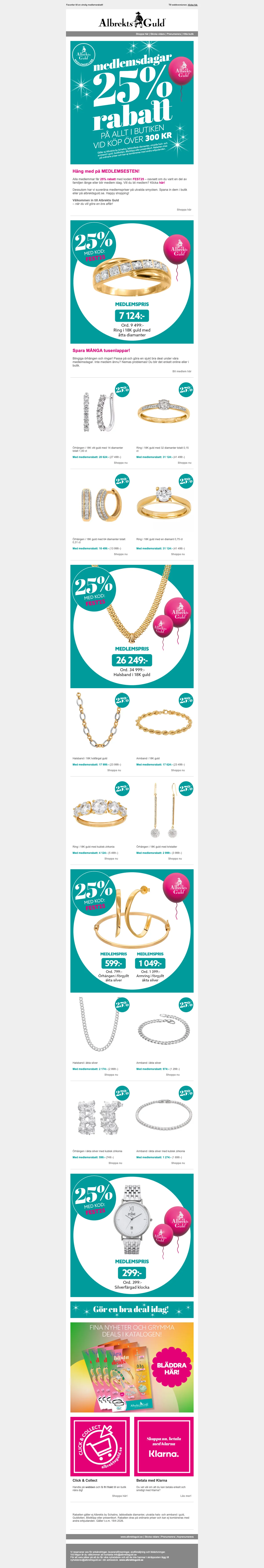 Om man går med i Albrekts Gulds medlemsklubb så finns det fina erbjudande i potten. Du samlar även poäng på varje köp, oavsett om du handlar online eller i en av kedjans fysiska butiker. Du blir även inbjuden till speciella medlemsdagar.