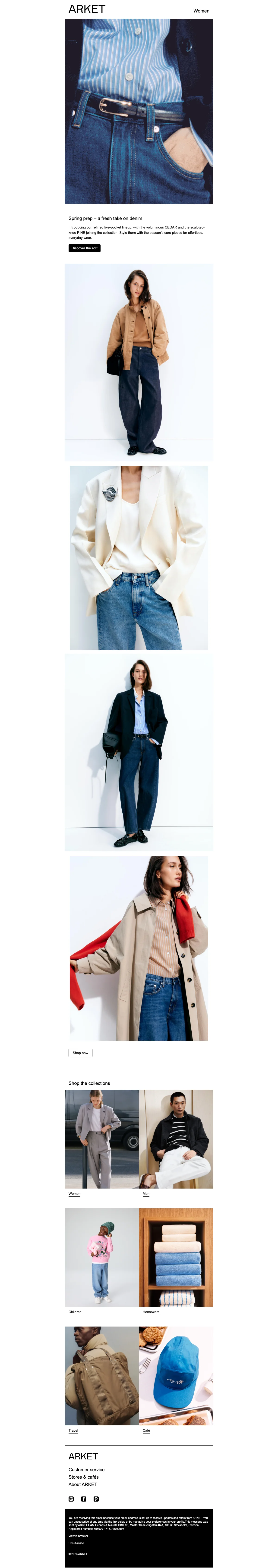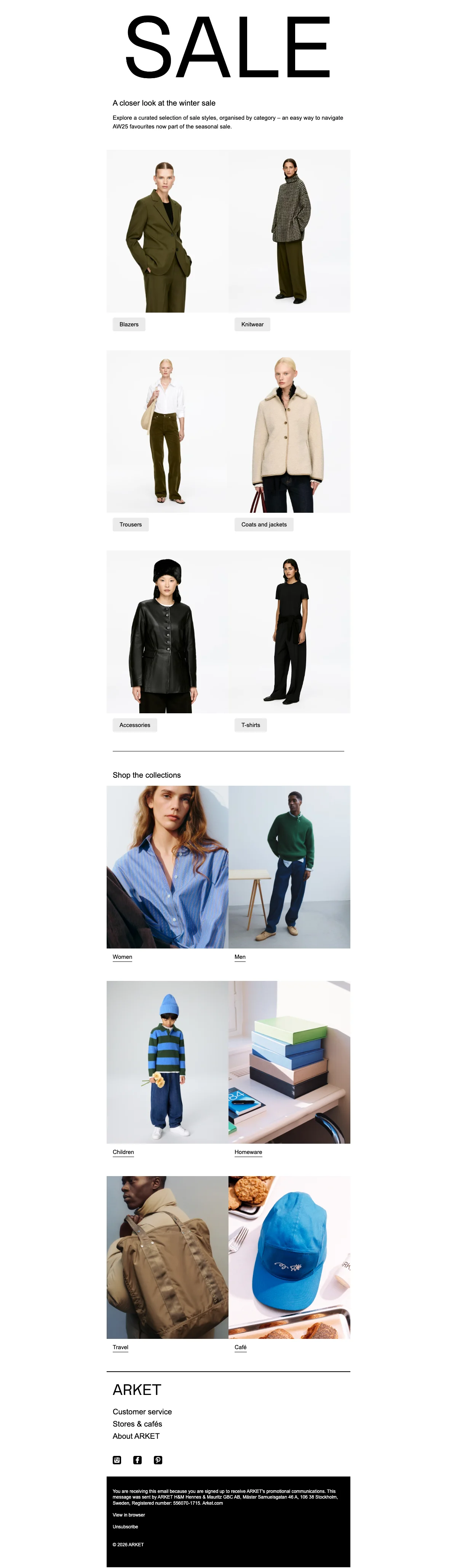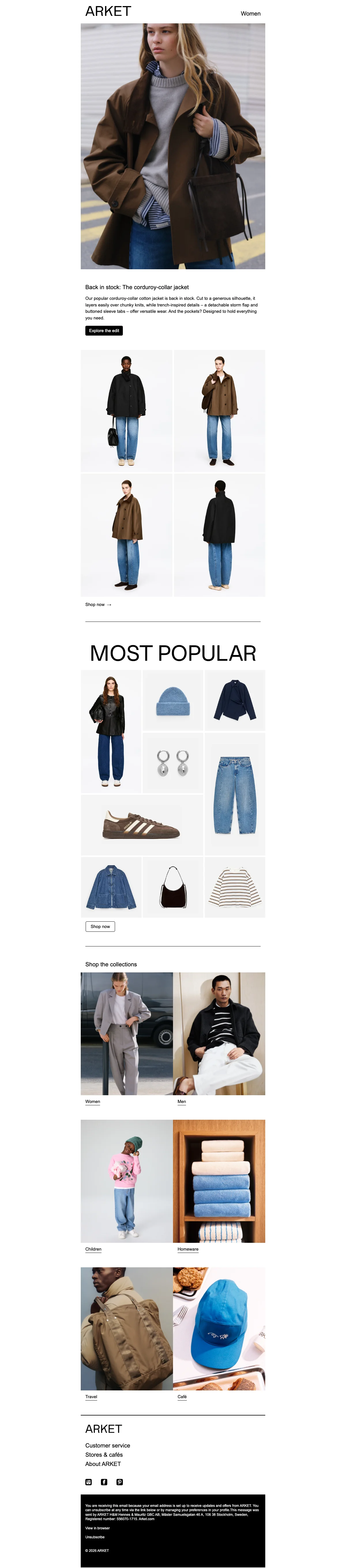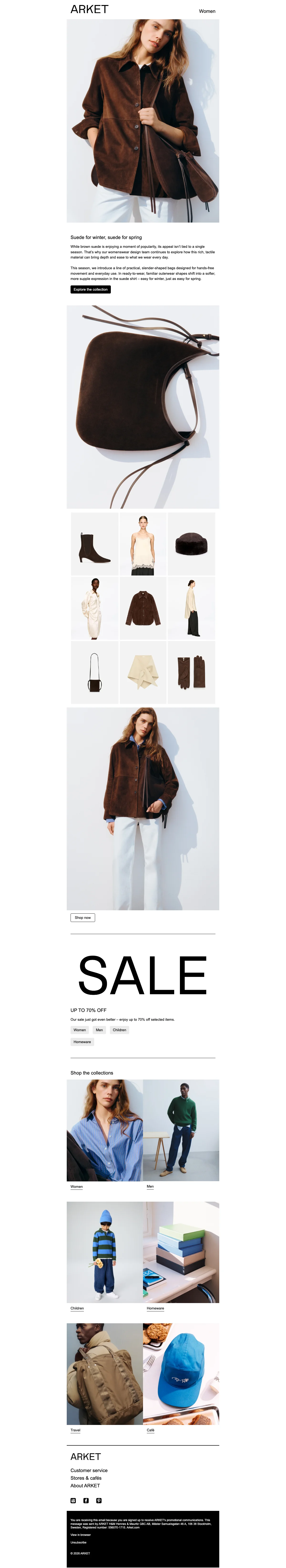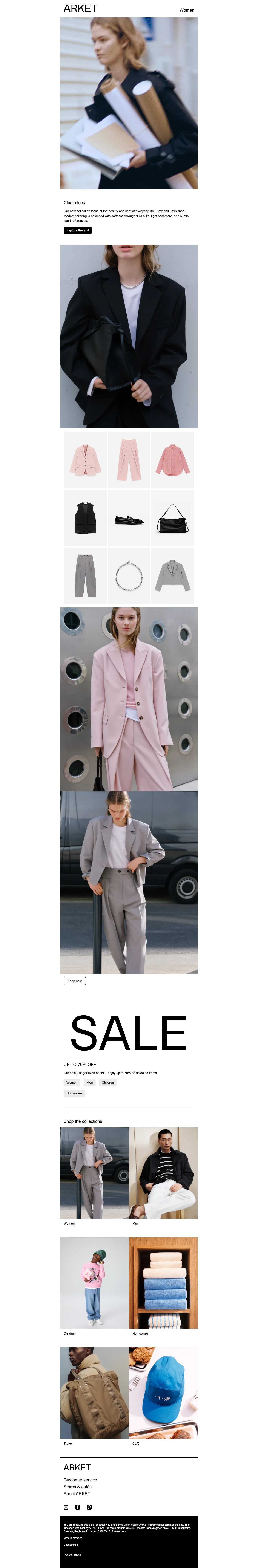 ARKET är en modern livsstilsbutik som erbjuder kläder, skor och accessoarer för kvinnor, män, barn, baby samt produkter heminredning och researtiklar och under ett och samma tak. I designstudion och på huvudkontor på Södermalm i Stockholm arbetar mer än 200 personer från olika delar av världen med ett gemensamt mål det gemensamma målet att demokratisera kvalitet och göra hållbar design mer tillgänglig för fler människor. Kläderna och produkterna är noggrant tillverkade för att hålla och uppskattas under flera säsonger och årstider. Handla hållbart och klimatsmart samtidigt som du sparar pengar genom att använda någon av rabattkoderna från Saleduck.