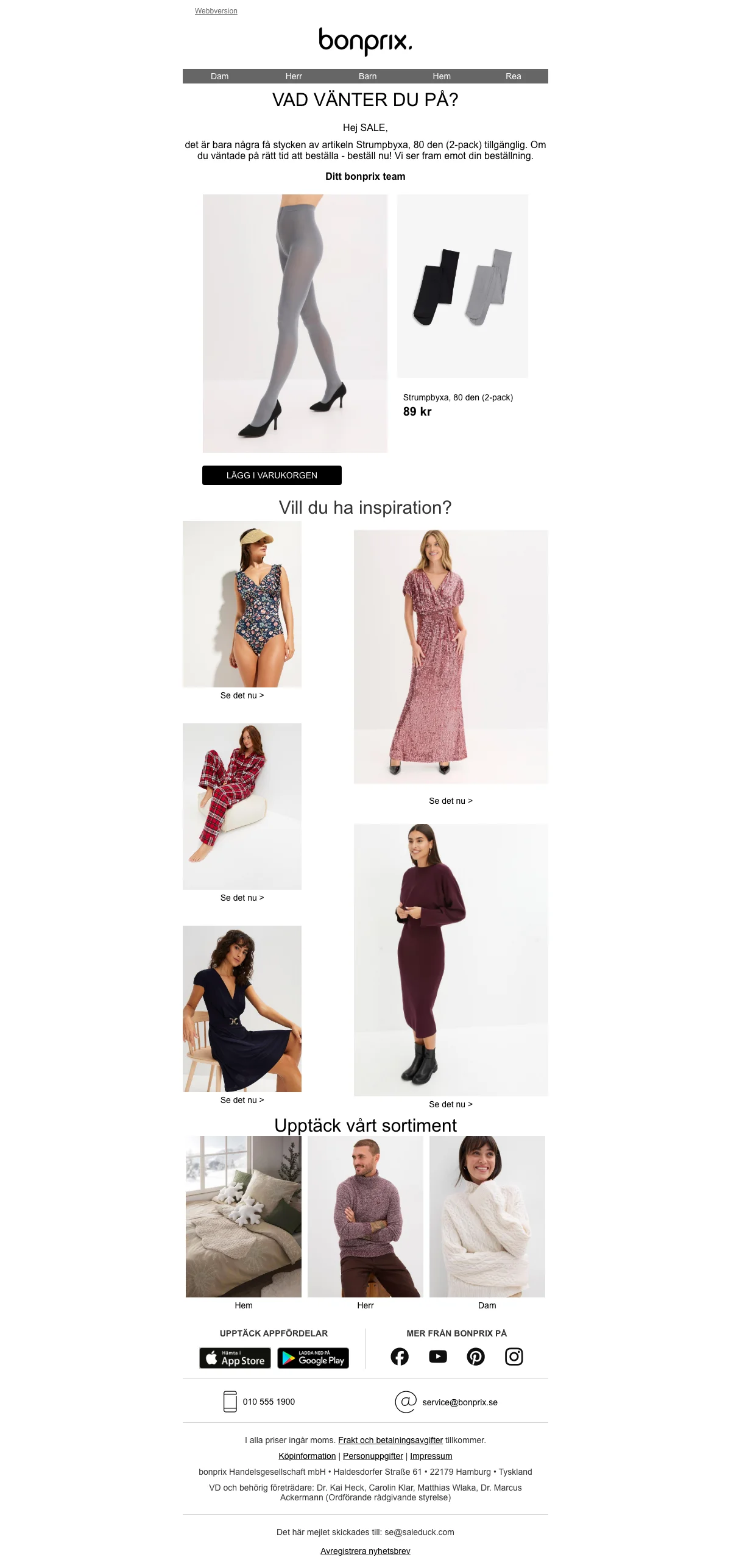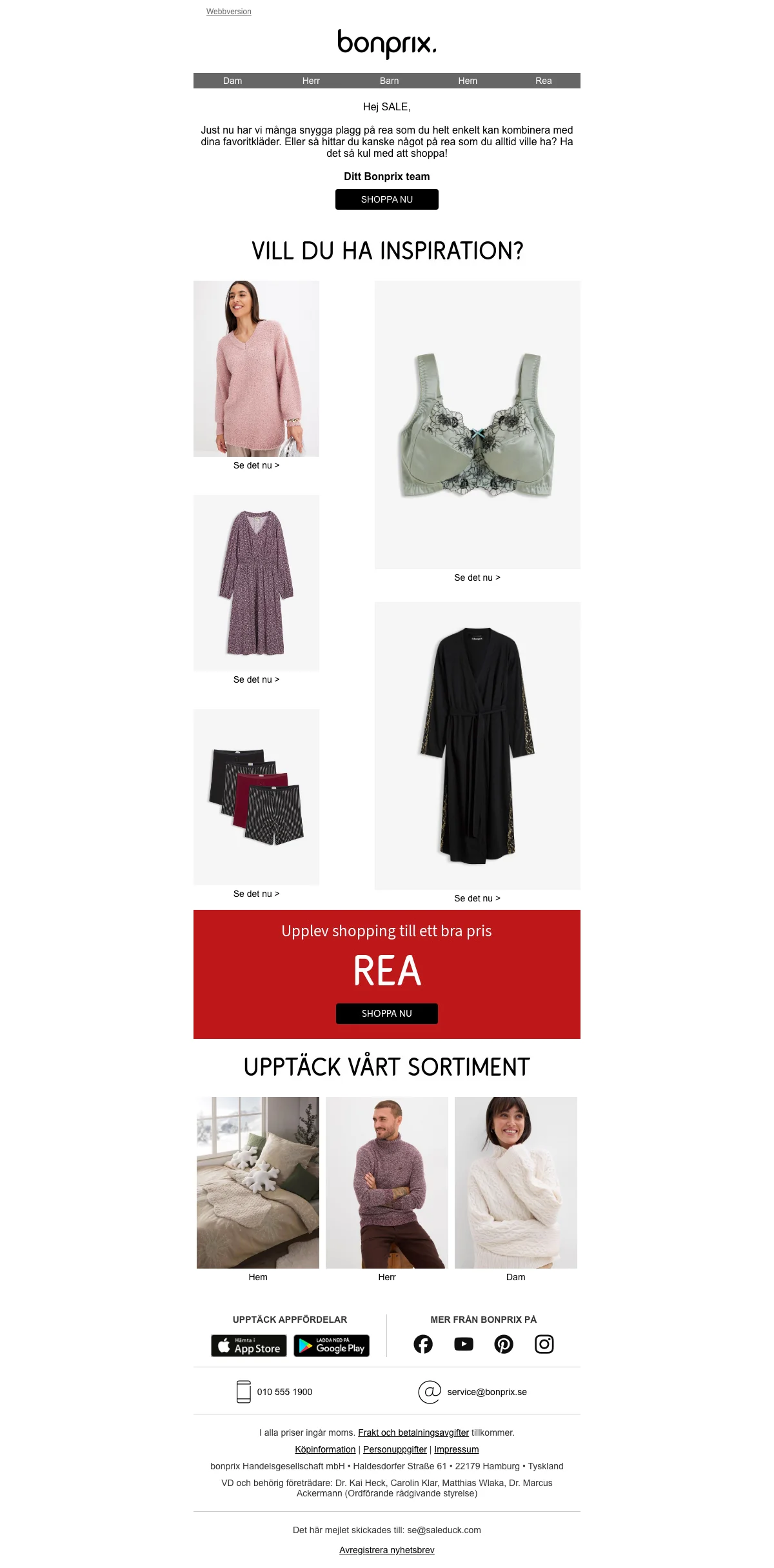 Den som vill fynda jackor, mammakläder, underkläder eller annat mode från Bonprix bör även hålla utkik efter; - Rea: På hemsidan kan du hitta en intressant kampanj, rabatt eller utförsäljning hela året runt. Du behöver inte längre vänta på mellandagsrean eller sommarrean för att hitta väskor, leggings eller erotiska underkläder. När du besöker hemsidan kan du klicka dig vidare på fliken för Rea och hitta intressanta rabatter som passar säsongen. - Nyhetsbrev: Detta är det bästa sättet att hålla sig uppdaterad för news, uppdateringar i katalogen, hitta en voucher eller kampanjkod. Anmäl dig till nyhetsbrevet och se till att inte missa några erbjudanden. Det går även att avbeställa det när man så helst önskar.