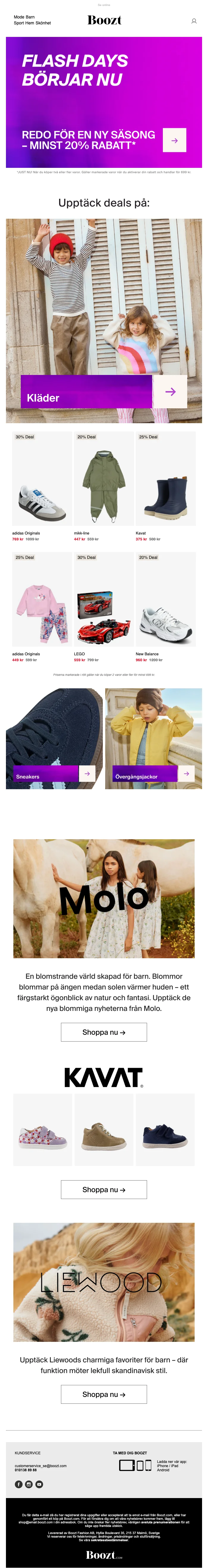 1. Boozt är onlinebutiken som erbjuder ett stort urval av kläder, skor, sport, accessoarer, skönhetsprodukter och home för hela familjen. I sortimentet finner du över 600 skandinaviska och internationella varumärken och designers. Handla enkelt och smidigt hem mode för dam, barn och herr med snabba leveranser inom 1-2 vardagar och prova bekvämt hemma med fria returer i 30 dagar. Få en ännu mer fantastisk shoppingupplevelse online genom att klicka hem dina nya favoritplagg till garderoben hos Boozt med rabattkoder från Saleduck!