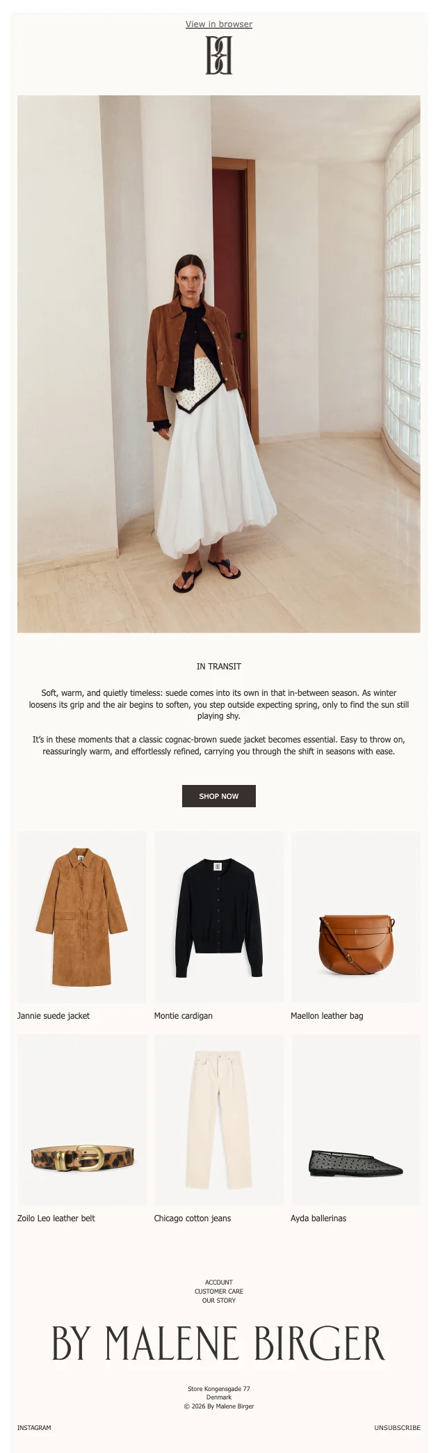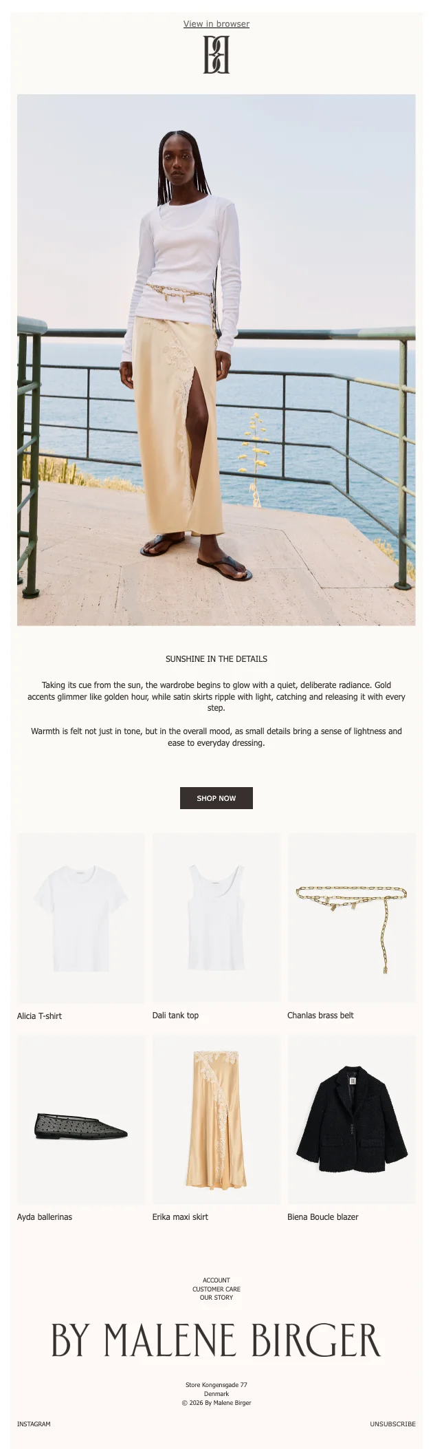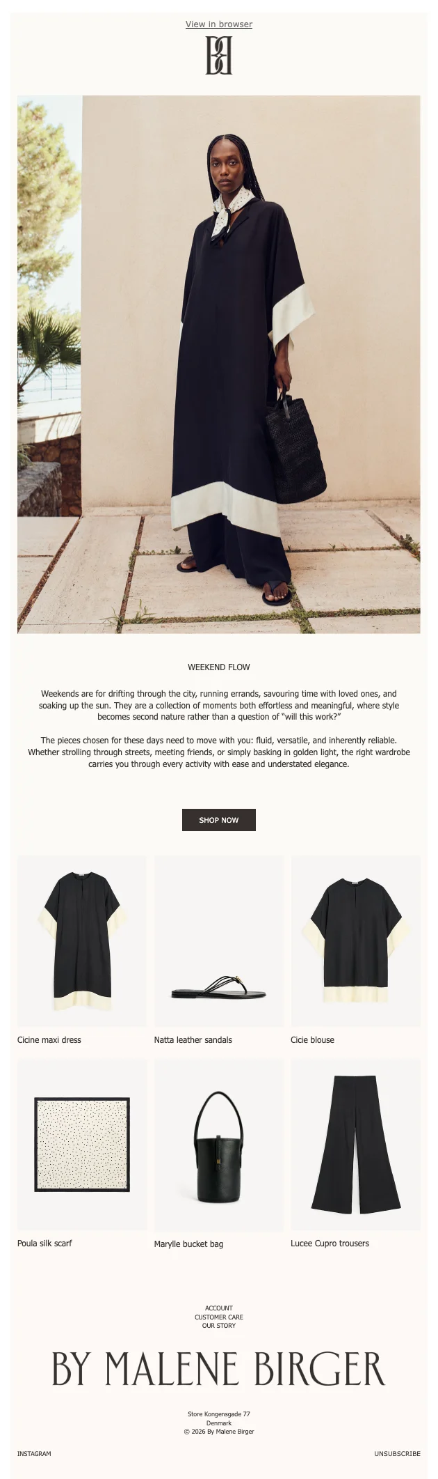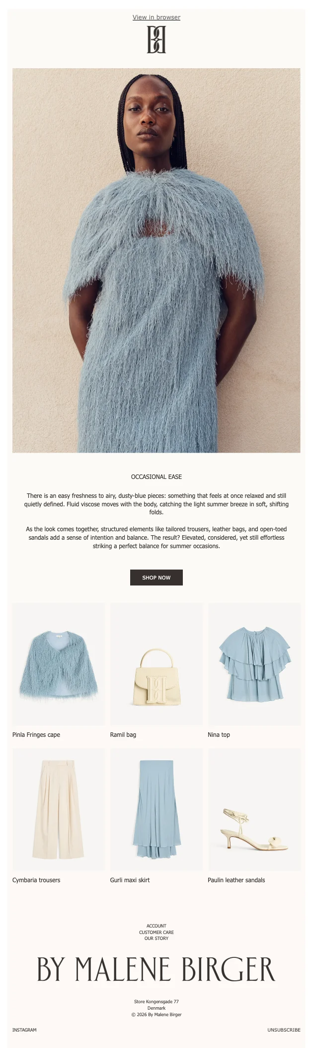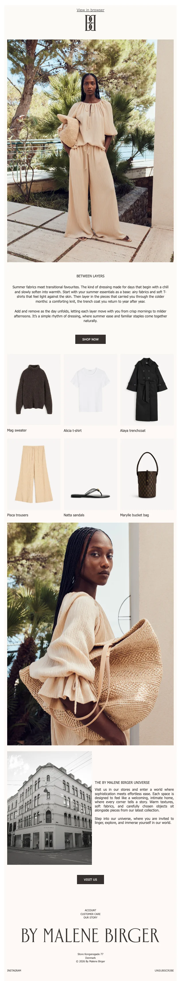 På By Malene Birger säljer de kläder som är både lyxiga och prisvärda. I butiken kan du till exempel shoppa kläder som klänning, skjorta, linne, t-shirt, kofta, blazer, kappa och jacka, jumpsuit, byxa, kjol och underkläder för dam. Priset är högre än för du hittar i en vanlig butikskedja men lågt jämfört med andra kända designmärken. Därför kan du shoppa mode som de flesta har råd med, och plagg som går att bära länge.