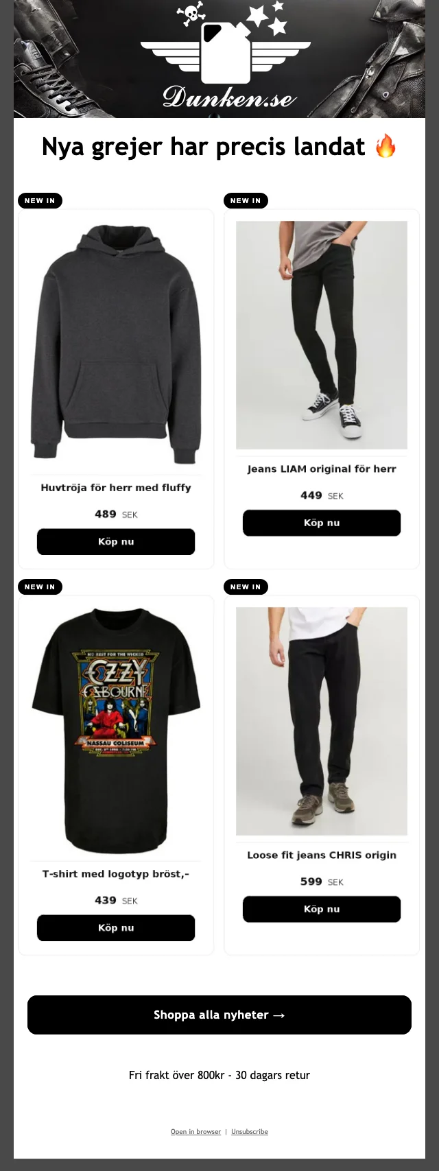 Om du vill prenumerera på nyhetsbrevet hos Dunken kan du göra det enkelt genom att registrera dig i webshoppen. På så vis får du sedan olika typer av kampanj och en och annan rabattkupongkod skickade till dig via mail så att du aldrig missar ett bra deal. Du kan såklart ta tillbaka din anmälan enkelt om du vill sluta ta emot mail.