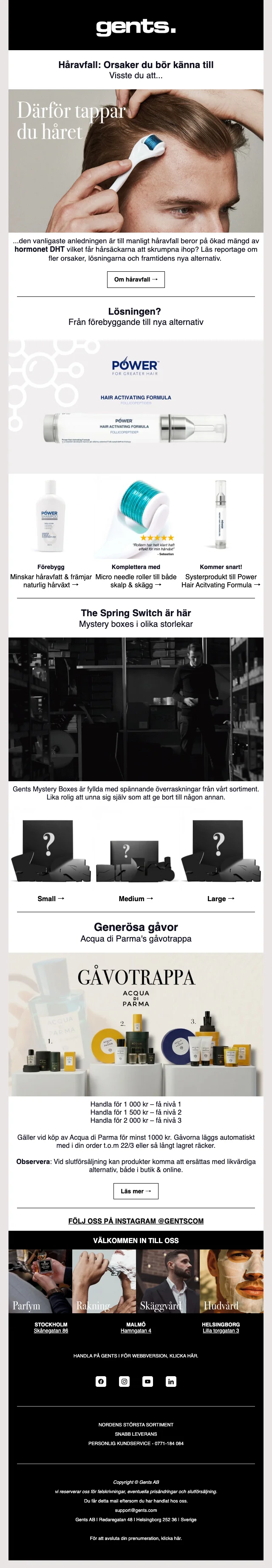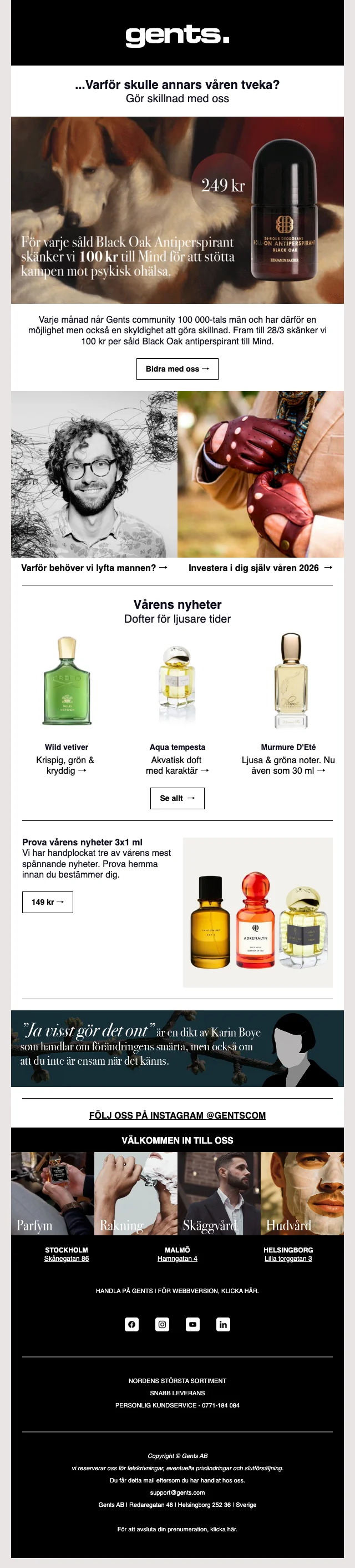 Gents strävar efter att erbjuda det mest omfattande sortimentet av parfymer, hud- och hårvårdsprodukter, intimartiklar, skägg- och hårverktyg samt munvårdsartiklar. De arbetar ständigt för att inkludera de främsta varumärkena och de senaste dofterna på marknaden. Oavsett om du föredrar en fräsch och blommig doft eller en mer robust och kryddig parfym, så har de något som passar din smak perfekt. Utforska ett varierade urval och upptäck den idealiska produkten som kompletterar din unika personlighet.
