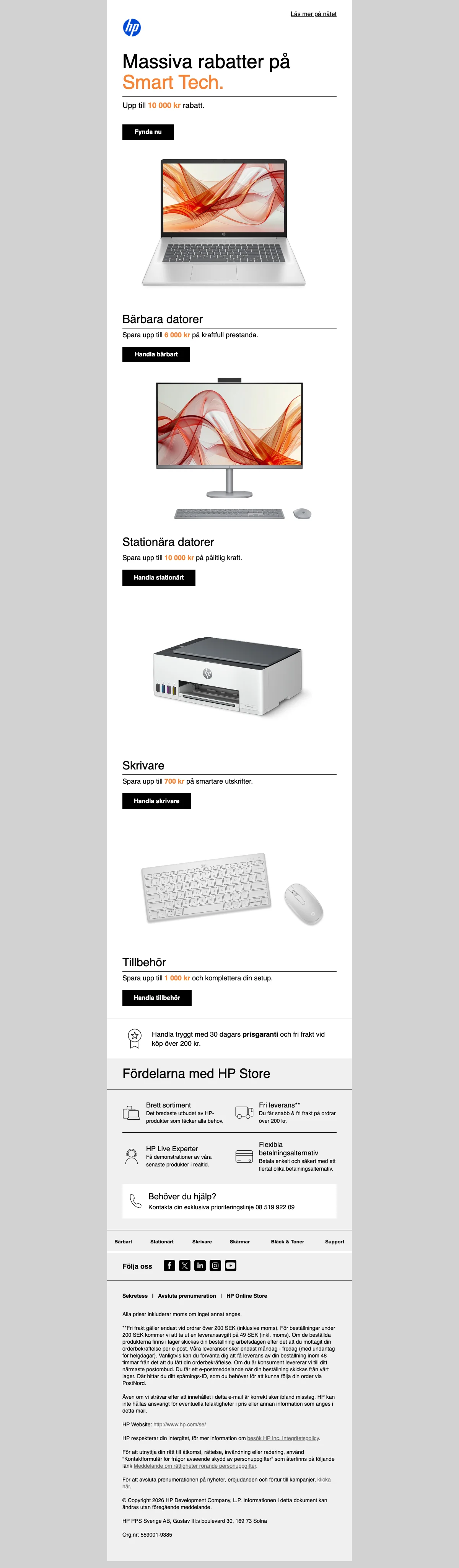 Hewlett Packard's egen webbutik, HP Store Sverige, är till för dig som behöver bärbara datorer, surfplattor, stationära datorer, skrivare, bläck & toner, bildskärmar samt tillbehör. Företagets teknik gör det enklare för dig som konsument eller företagskund världen över. Du hittar allt från den senaste tekniken och nyheterna till prisvärda produkter och artiklar. Oavsett om du vill hålla dig uppdaterad med de senaste produkt-släppen eller fynda en utgående artikel är du på rätt plats om du gillar teknik.