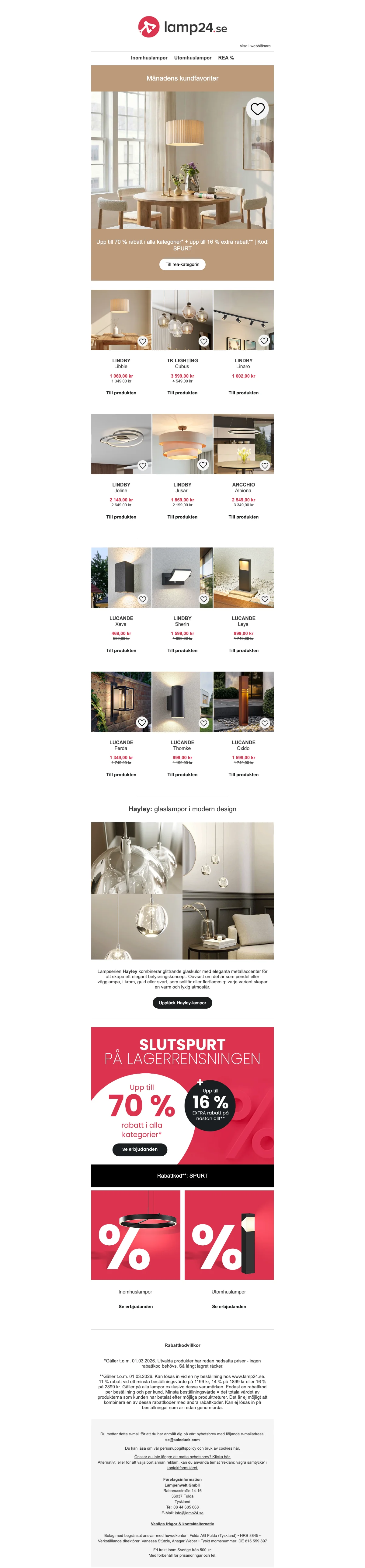 På hemsidan är det alltid REA vilket betyder att du alltid kan göra olika smarta fynd. Du kan till exempel shoppa billiga lampor som taklampa, lysrör och takspot med mycket rabatt. Att hålla utkik efter rätt erbjudande är väldigt listigt och på så sätt kan du spara in många kronor på dina lampor och din belysning. Vi på Saleduck hjälper dig med att hålla reda på när ett extra attraktivt erbjudande dyker upp så besök oss gärna för att se vilka varor du kan fynda för stunden.