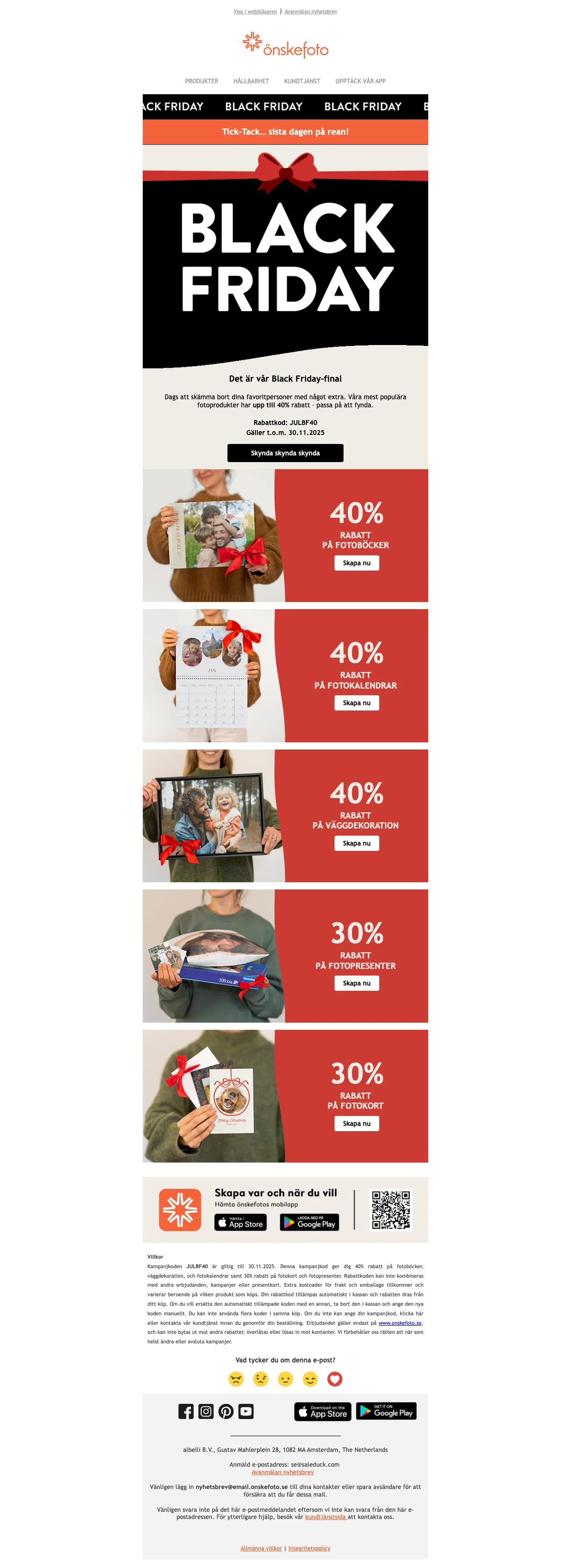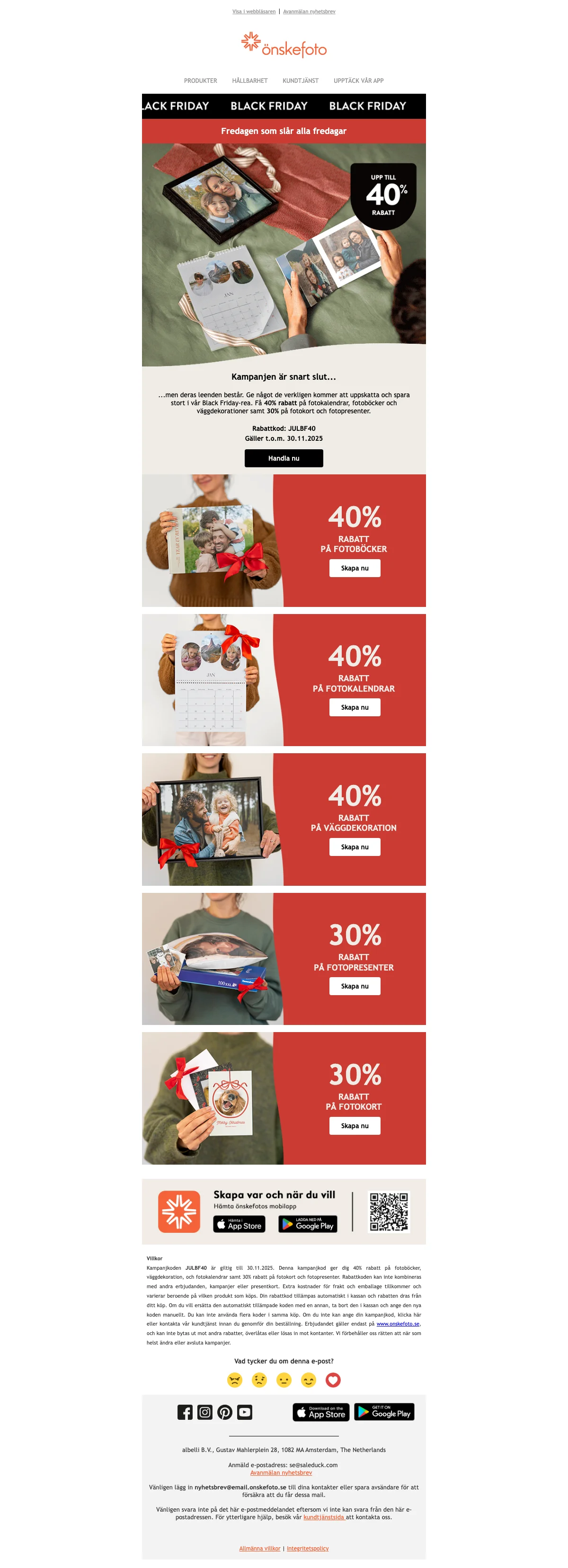 På Önskefoto. kan du använda dina bilder till att skapa olika fotoprodukter. Till exempel kan du skapa fotobok, fotokort, fotokalender, foto på canvas och ett personligt mobilskal. Att framkalla sina bilder som olika produkter är ett väldigt roligt sätt att spara och visa upp sina digitala minnen. Det är också en utmärkt idé som present och en väldigt uppskattad gåva. Du kan till exempel ge din bästa kompis en fotobok i present som samlar olika bilder från era gemensamma resor, eller ge mormor en personlig kalender som föreställer hennes kära barnbarn. När du handlar en fotoprodukt på Önskefoto.se kan du dessutom använda en rabattkod för att göra din köpupplevelse ännu bättre.