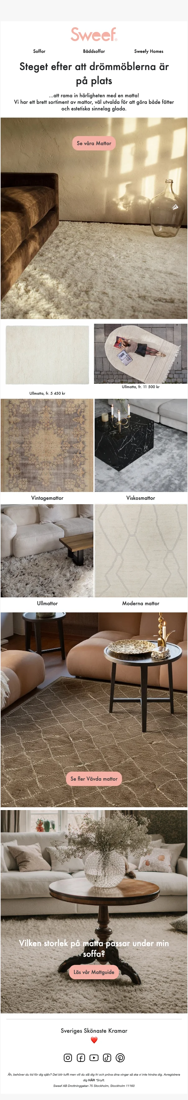 Butiken är välkända för sina vackra soffor i sammet. Med ett stort urval av olika modeller så som Mammuten, Björnen och Valen etc. kan du beställa en sammetssoffa i antingen en av deras standardkulörer för just den önskade modellen, alternativt välja en egen färg ur deras stora urval. Här på Saleduck kan du hitta erbjudanden på en Sweef soffa antingen för att hålla koll på nyheter eller för att hitta soffor till bättre priser med en rabattkod exempelvis. Butiken erbjuder många olika modeller av soffor och andra möbler och du hittar allt mellan bäddsoffor, modulsoffor, djup soffa, pallar, sänggavel, mattor etc. Du hittar även möbler i andra material än sammet, exempelvis skinn, polyester, läder etc.