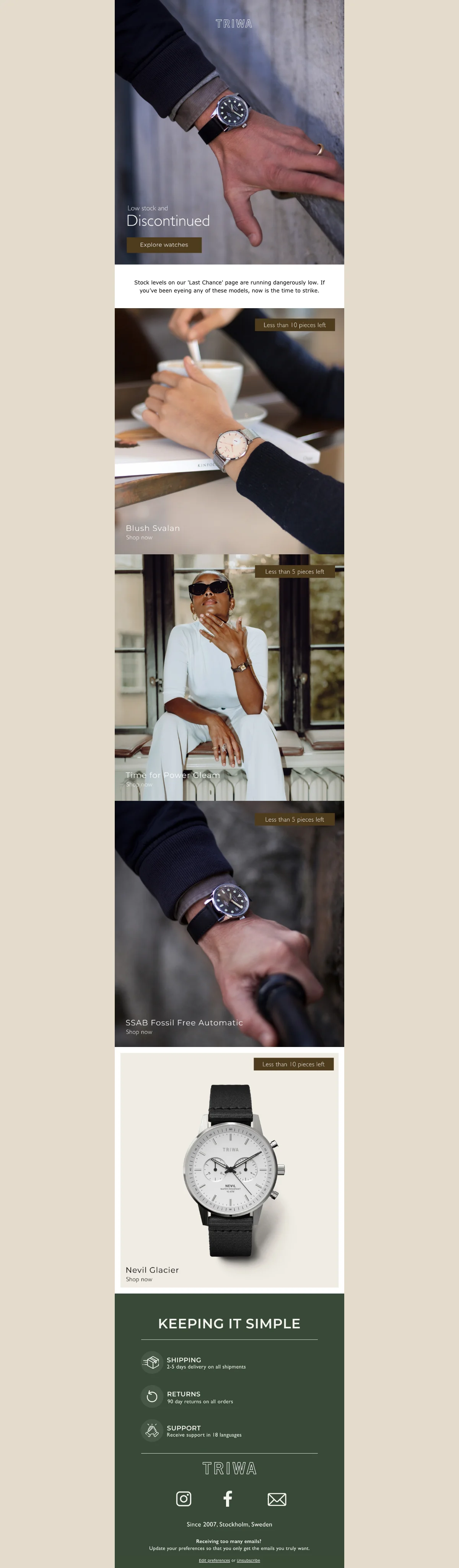 Hos Triwa kan du hitta massor av olika exklusiva och snygga klockor! I butiken kan du shoppa ett stort utbud av olika modeller av klockor och klockarmband samt olika solglasögon som du kan matcha din klocka med för en komplett outfit. När du handlar en Triwa klocka online från Triwas webshop kan du använda dig ut av en rabattkod eller Triwa promo code för att spara pengar men du kan också besöka butikens väldigt populära kategori för outlet där du kan hitta massor av olika intressanta produkter på REA som du kan fynda billigt.