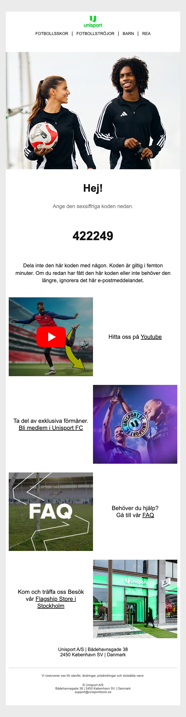 Behöver du ny fotbollsutrustning? Gå in på Unisportstore, en hemsida där du hittar sportkläder, skor och tillbehör. Unisport har funnits på nätet i ungefär tjugo år och har fått massor med e-handelspriser. Beställ t.ex. en landslagströja eller fotbollsskor från Nike och använd en rabattkod från Saleduck för att spara en peng på ditt köp.
