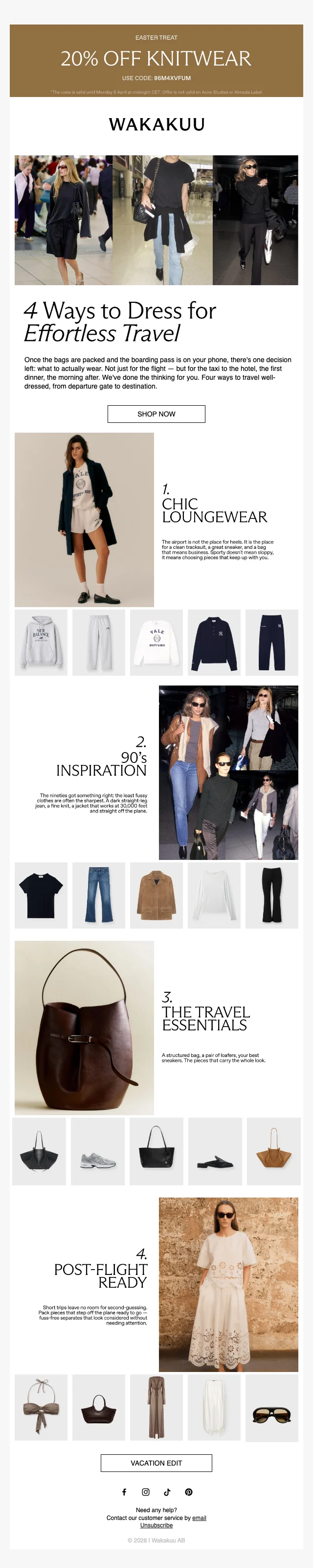 Trendiga kläder till kampanjpriser hittar du under Black Friday. Wakakuu ger dig chansen att beställa kläder, skor, väskor och accessoarer från kända designers till specialpris. Använd en rabattkod eller ta del av ett erbjudande för att spara på ditt köp.