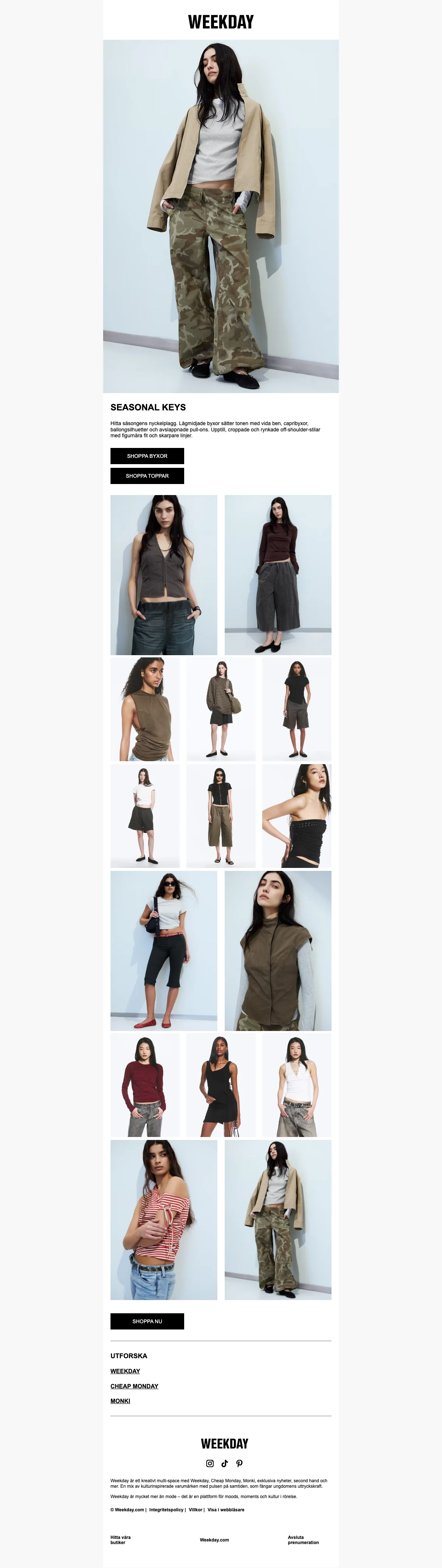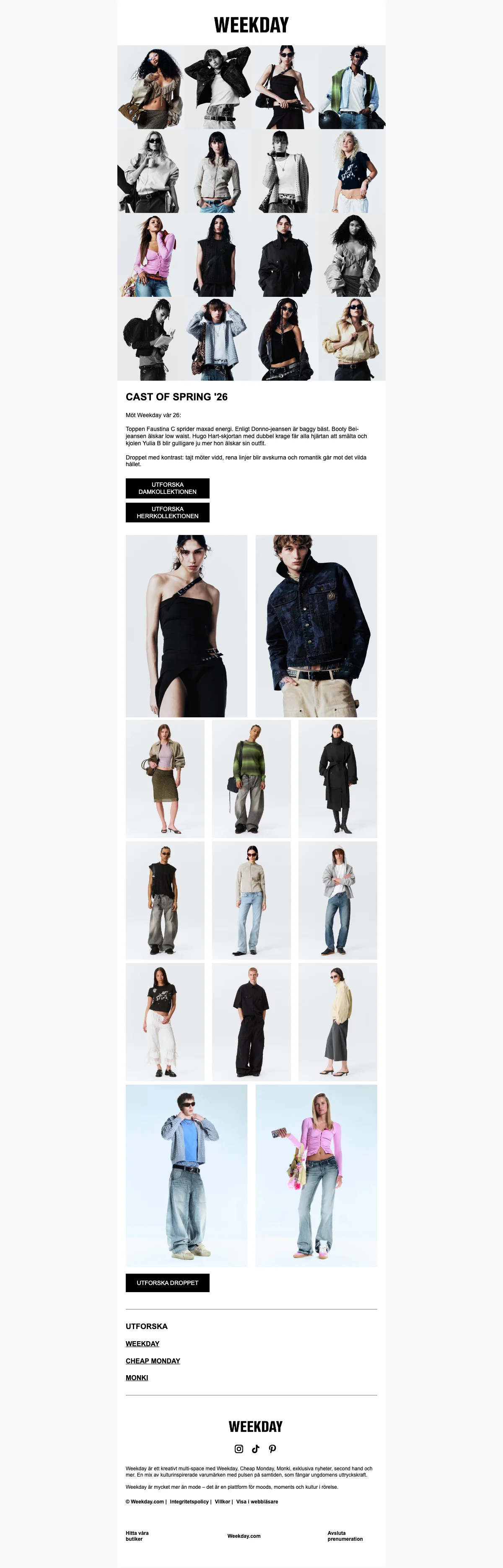 Vi övervakar kontinuerligt Weekday erbjudanden via den officiella webbplatsen, partnernätverk och webbshopens nyhetsbrev. Nya erbjudanden kontrolleras automatiskt och manuellt för giltighet.