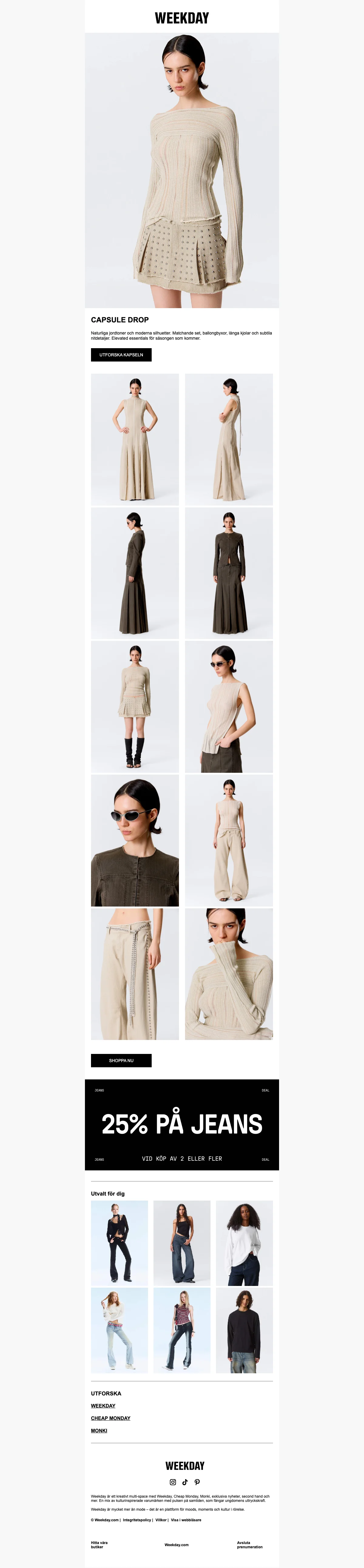 Få 25 % rabatt på dina favoriter bland jeans och basplagg från Weekday. Passa på innan erbjudandet försvinner! Ett perfekt tillfälle att uppdatera garderoben med stilrena och tidlösa plagg.